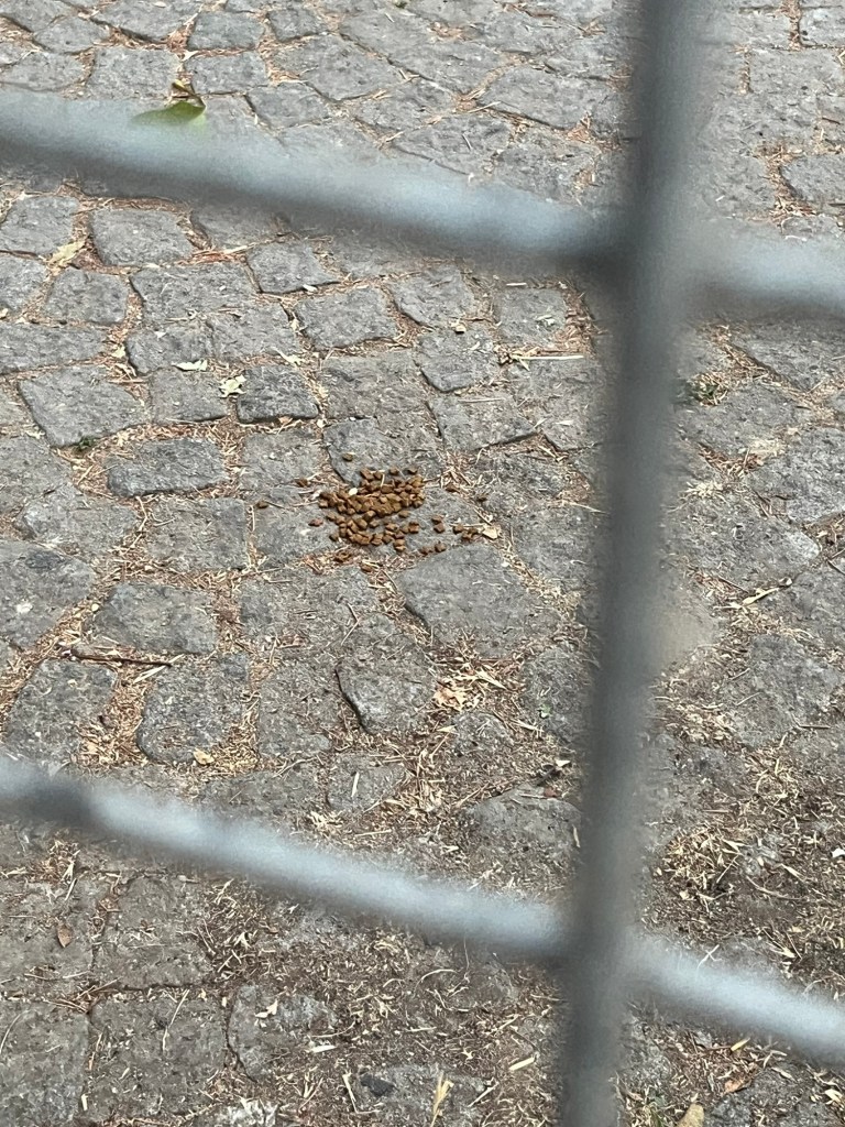 Bu teller arasında görünen mamalar parkın tam giriş kapısında. Tek yerde de değiller. İnsanların ve insanların köpekleri ile çok yoğun geçtiği noktalarda ana yerlerde. Baktığınızda ne güzel burada kediler besleniyor diyorsunuz. Hayır öyle değil. Düzgün yerlere koymadığımız kedi mamalarına insanlar dikkat etmeyip basıyor, kediler mamaları yerken yanından geçen köpekleri görünce o mamalar boğazlarına diziliyor, aynı yerden hızlı bir şekilde scooter ve bisiklete binen çocuklar geçiyor. Yavru bir kedinin bir kazaya uğraması an meselesi. Benim kendi canavarlarım açısından kedilere gelecek herhangi bir zarar yok. Ama ben dikkat etmezsem oyun niyetiyle hamle yapıp beni düşürebilirler.